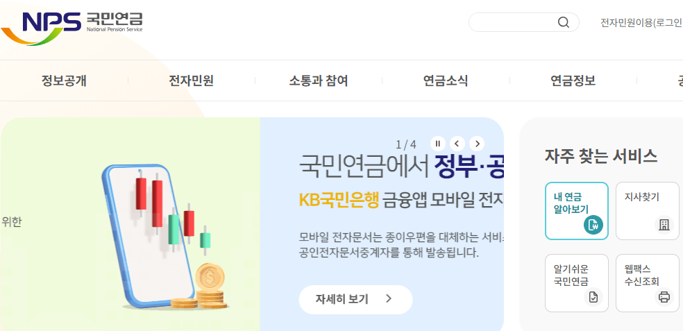 국민연금공단 사이트로 들어가신 다음 우측 상단에서 자주 찾는 서비스를 찾아서 내 연금 알아보기를 클릭합니다.