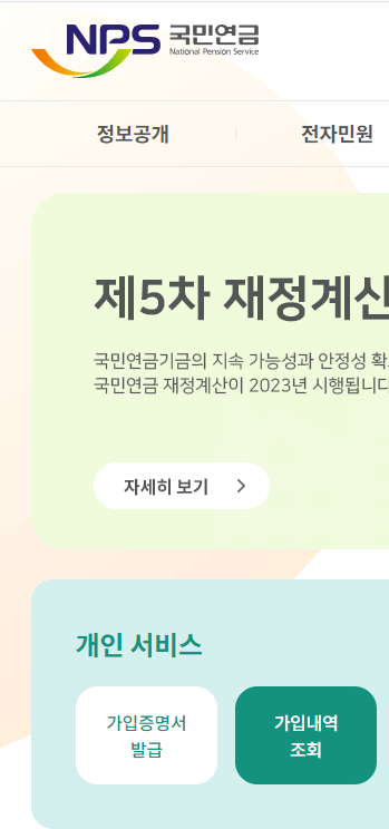 국민연금공단 사이트에서 가입내역 조회 화면을 클릭한 후 본인 인증을 추가로 진행합니다.