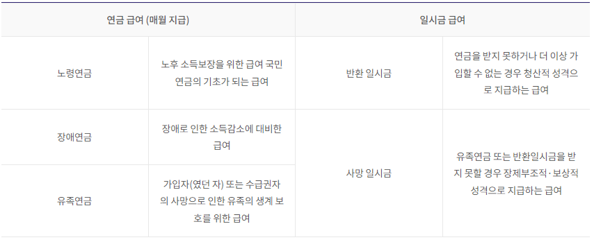 연금급여에는 노령연금(분할연금 포함), 장애연금, 유족연금이 있고 일시금급여에는 반환일시금과 사망일시금이 있습니다.