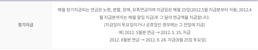 그런데 매월 지급되는 연금(노령, 장애, 유족연금)은 청구일로부터 역산을 하여 최근 5년 이내의 급여분은 지급받을 수 있고, 그 이후에는 매월 해당 월에 연금액을 지급받을 수 있습니다.