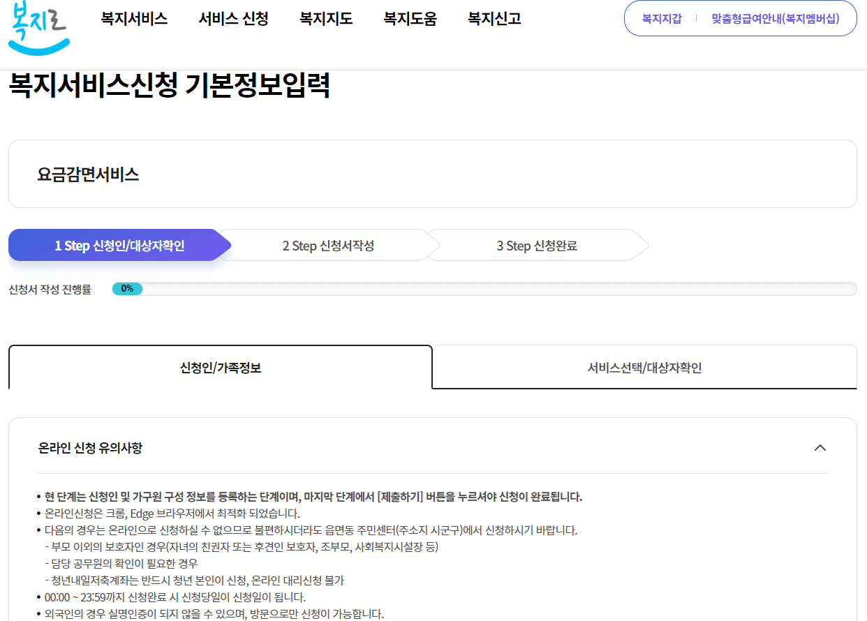 복지급여 신청 페이지가 뜨면 아래로 쭈욱 내려서 요금감면서비스를 선택합니다.