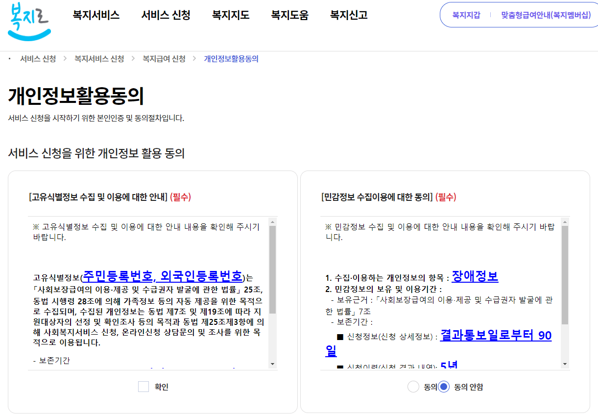 저장 후 다음단계를 누르고 확인을 누르면 개인정보활용동의 페이지가 뜹니다.