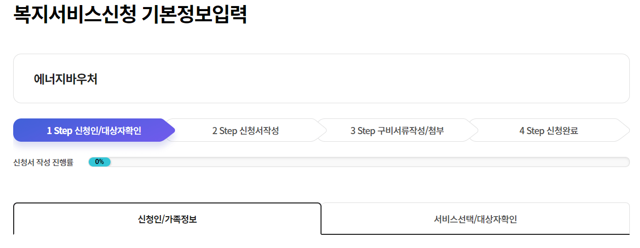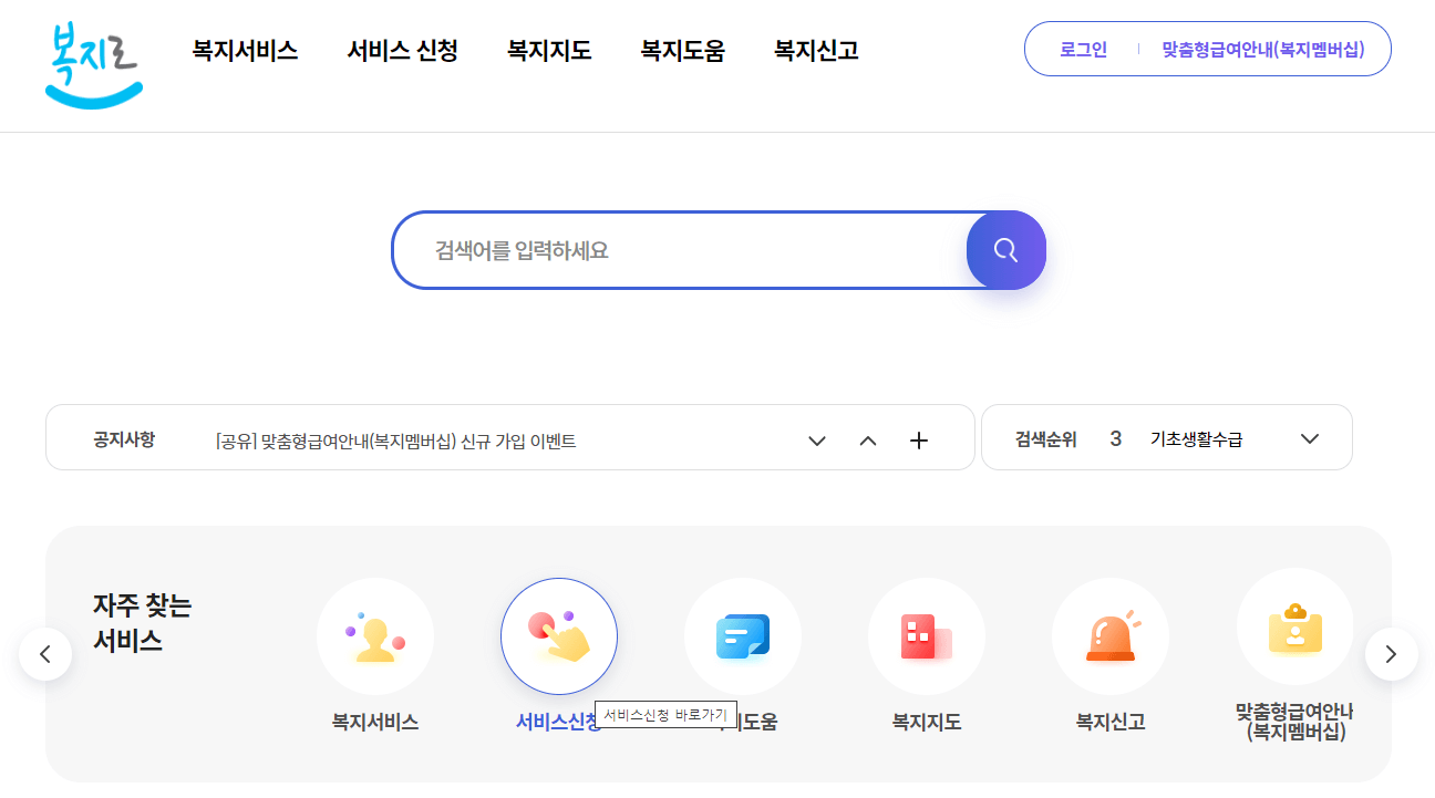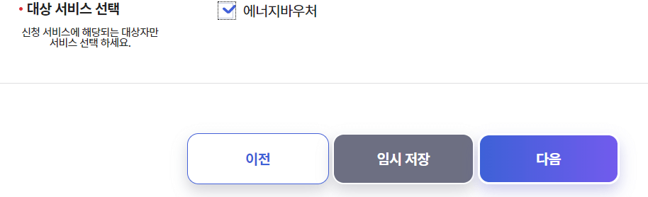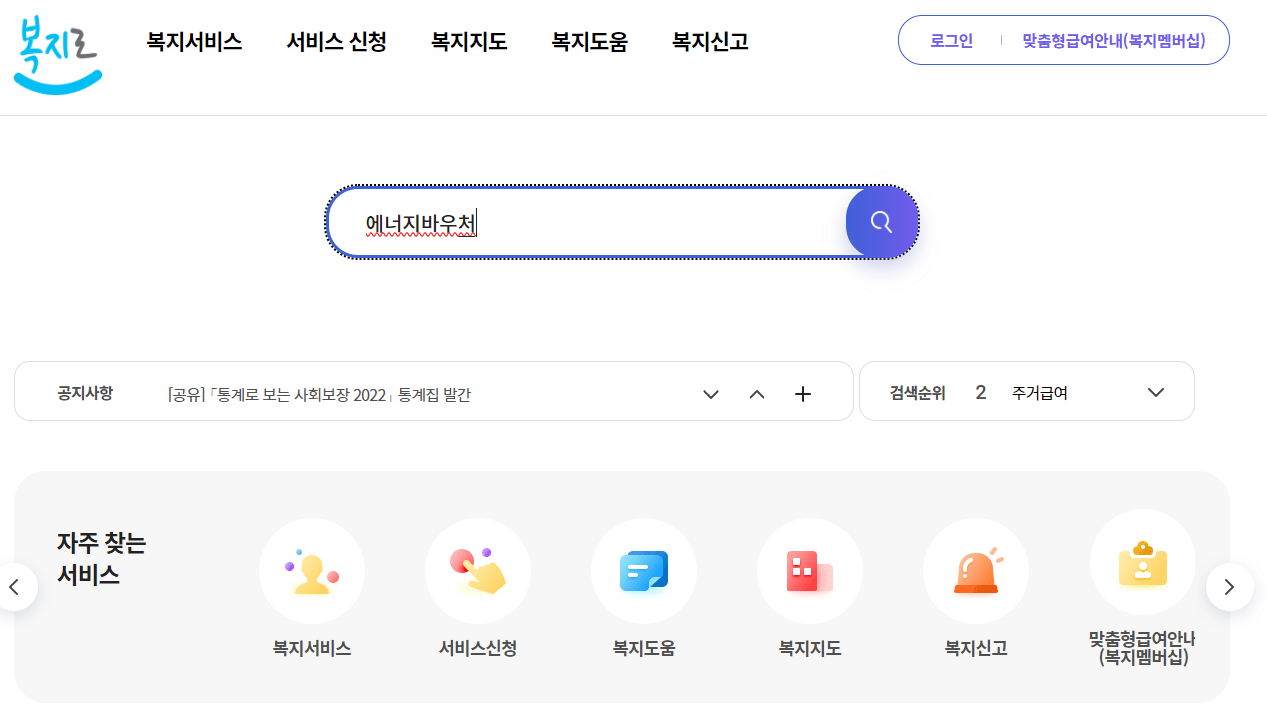 검색창에 '에너지바우처'를 검색하시거나 서비스신청 메뉴를 클릭합니다.