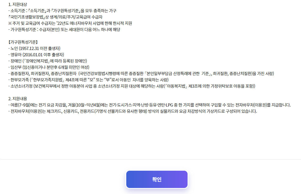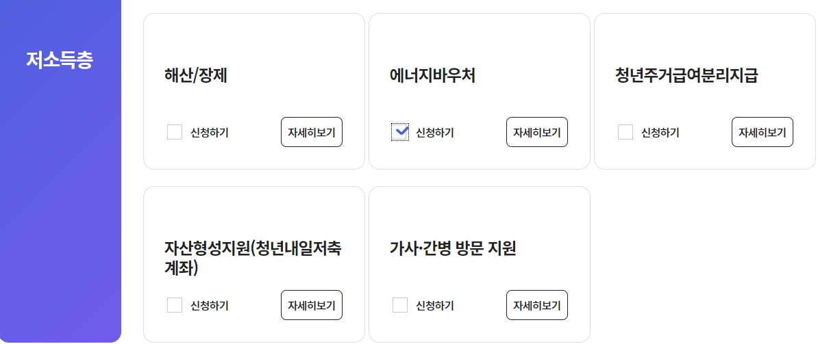 로그인 후 뜨는 화면을 아래로 쭈욱 내리다 보면 저소득층 메뉴에 있는 에너지바우처 탭이 보입니다.