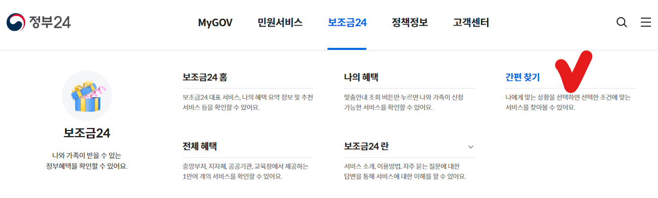 보조금24 홈페이지 보조금24 메뉴에서 간편 찾기를 클릭합니다.