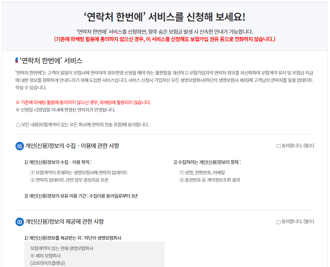내 보험 찾아줌 사이트에서 숨은 보험금 찾기를 하시면 '연락처 한번에' 서비스 신청에 대한 안내가 뜹니다.