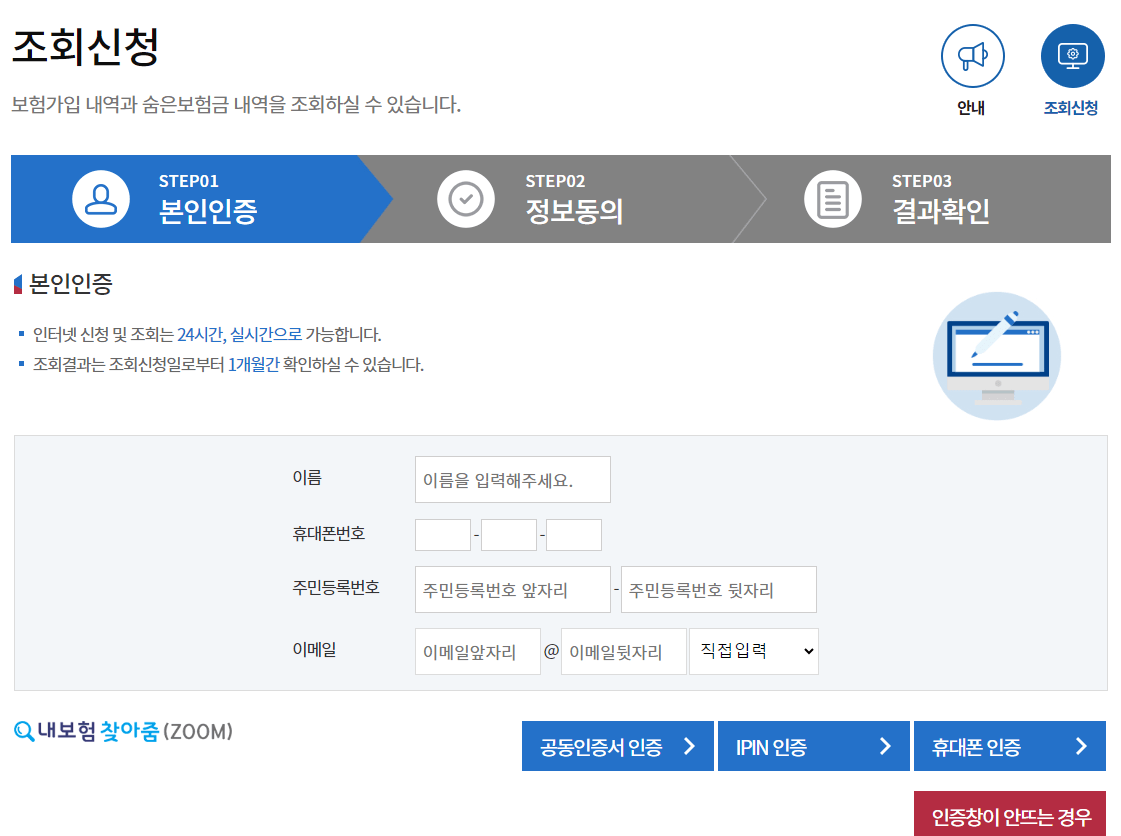 조회신청 페이지가 뜨면 본인인증을 합니다.
