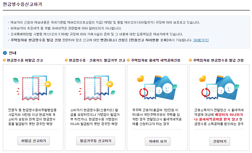 홈택스 홈페이지 상담/제보 메뉴에서 주택임차료(월세) 현금영수증 발급 신청을 누릅니다.