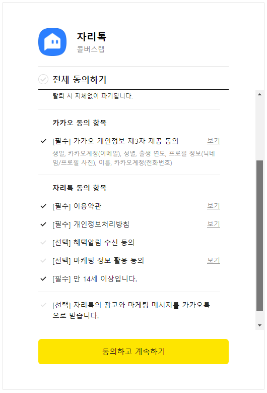 필수 항목 혹은 전체 동의 후 동의하고 계속하기를 누릅니다.