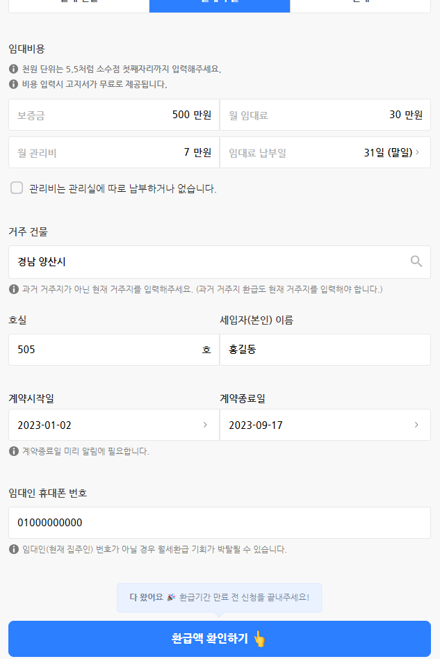 현재 거주하고 있는 건물 주소지를 입력한 후 계약시작일과 종료일, 임대인 휴대폰 번호(필수)를 입력하고 아래 환급액 확인하기 버튼을 클릭하면 환급금 신청 완료입니다.