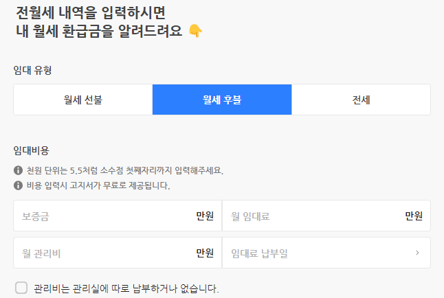 월 관리비가 없다면 '관리비는 관리실에 따로 납부하거나 없습니다.'를 체크하시면 됩니다.