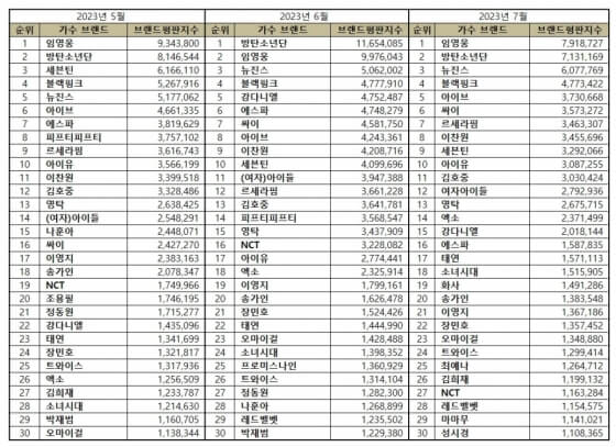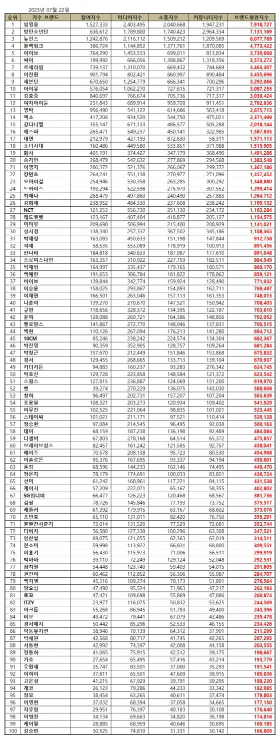 가수 임영웅 님이 2023년 7월 가수 브랜드평판 1위에 올랐습니다.