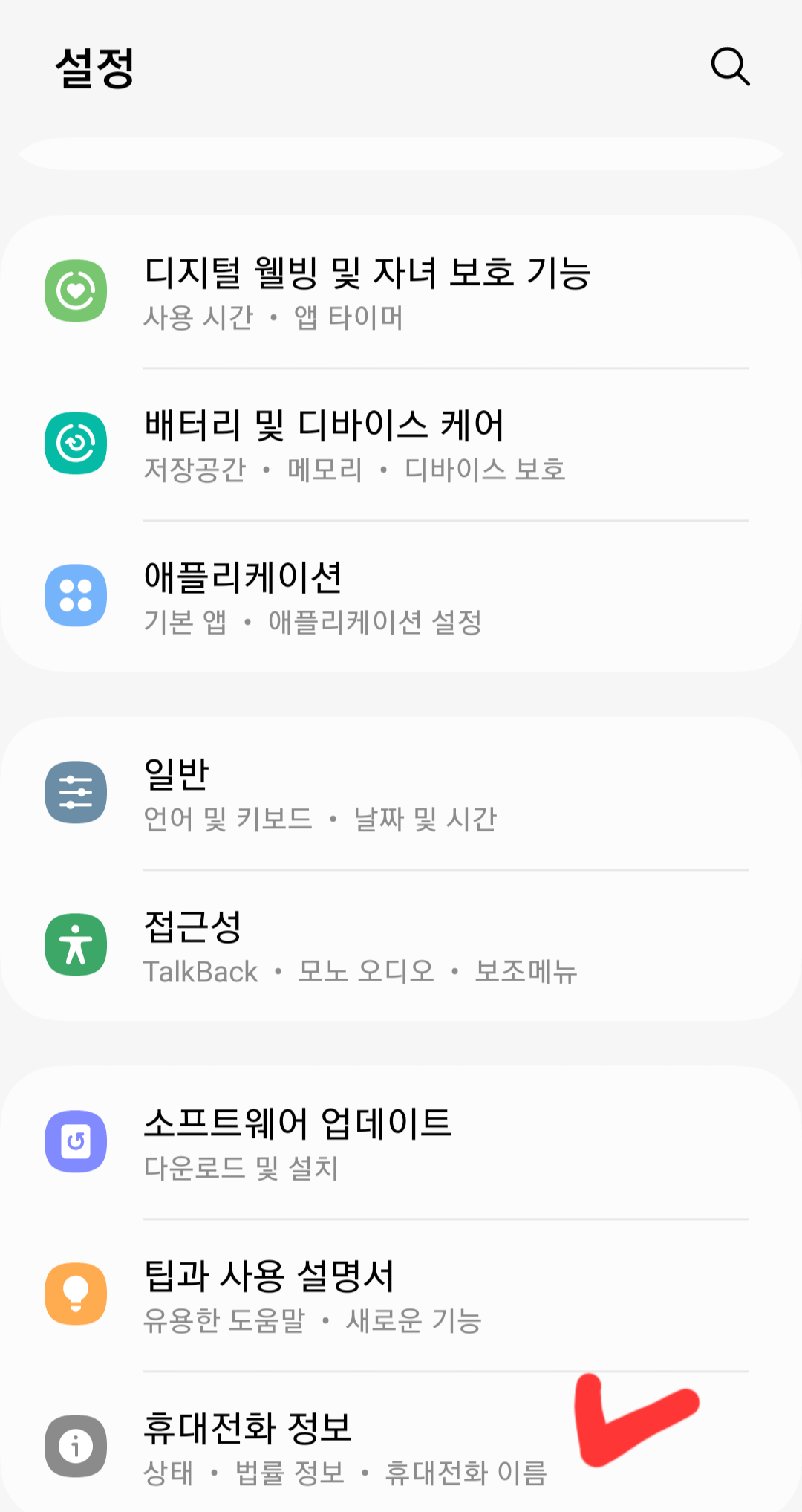 1. 핸드폰 설정으로 들어가 휴대전화 정보를 터치합니다.