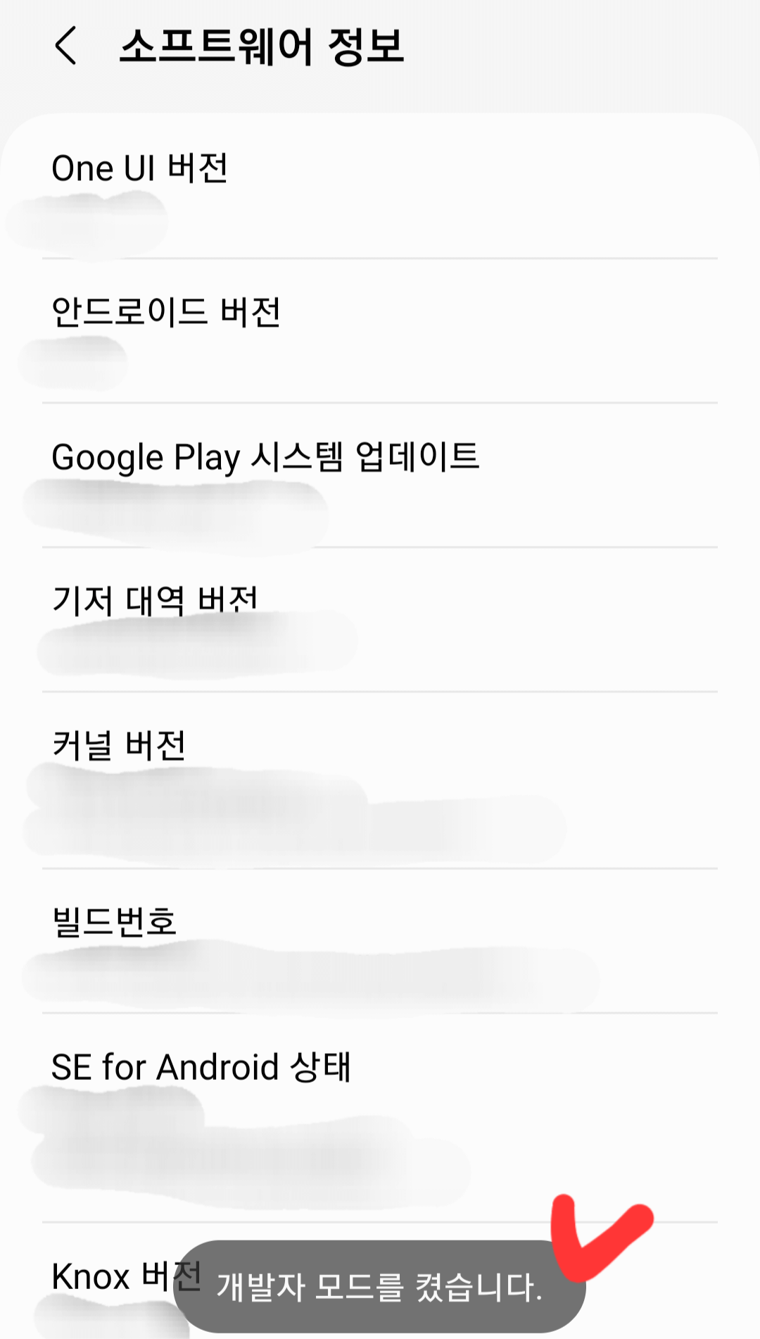 4. '개발자 모드를 켰습니다.'라는 글씨가 뜰 때까지 터치하시면 됩니다.